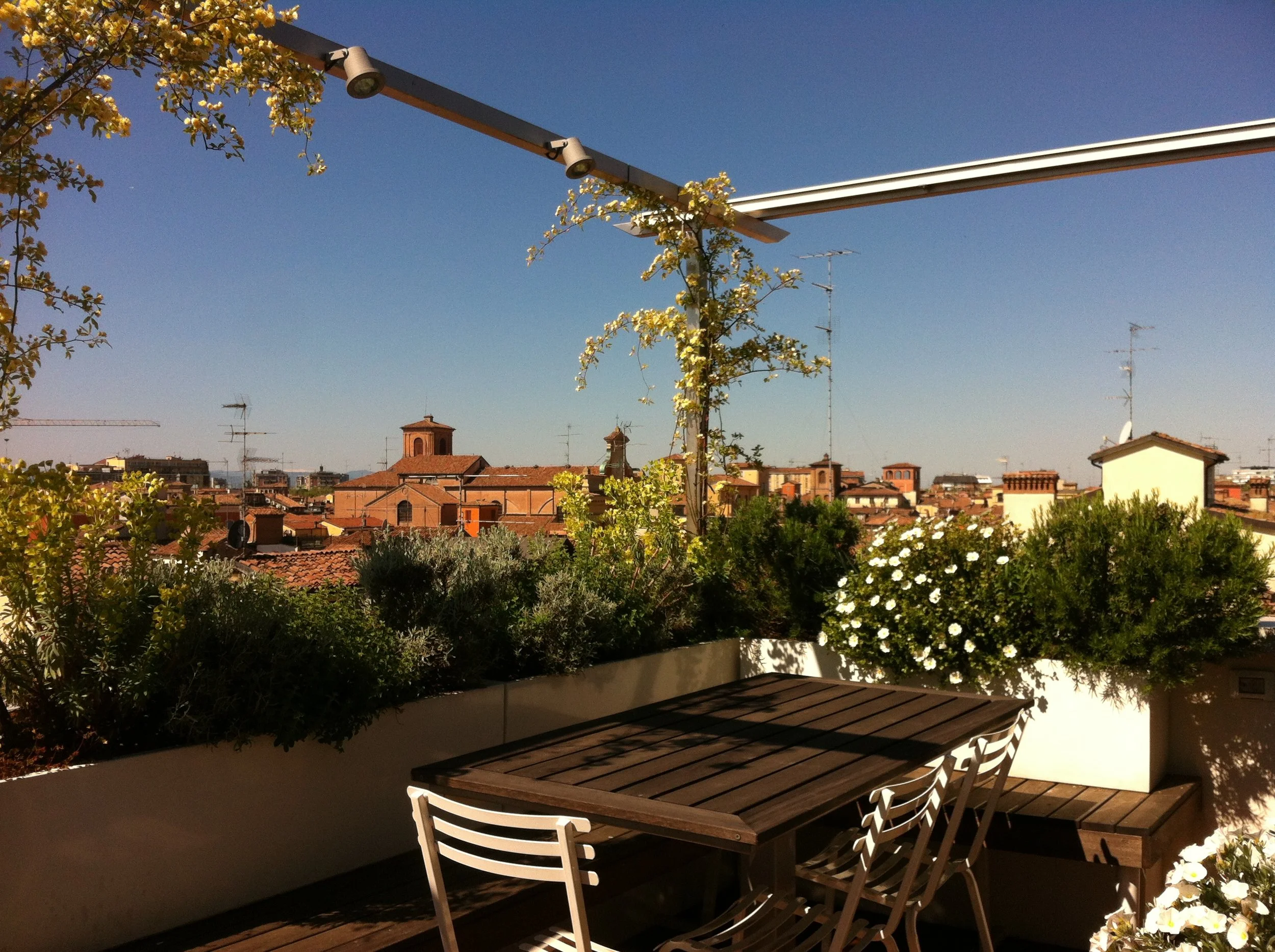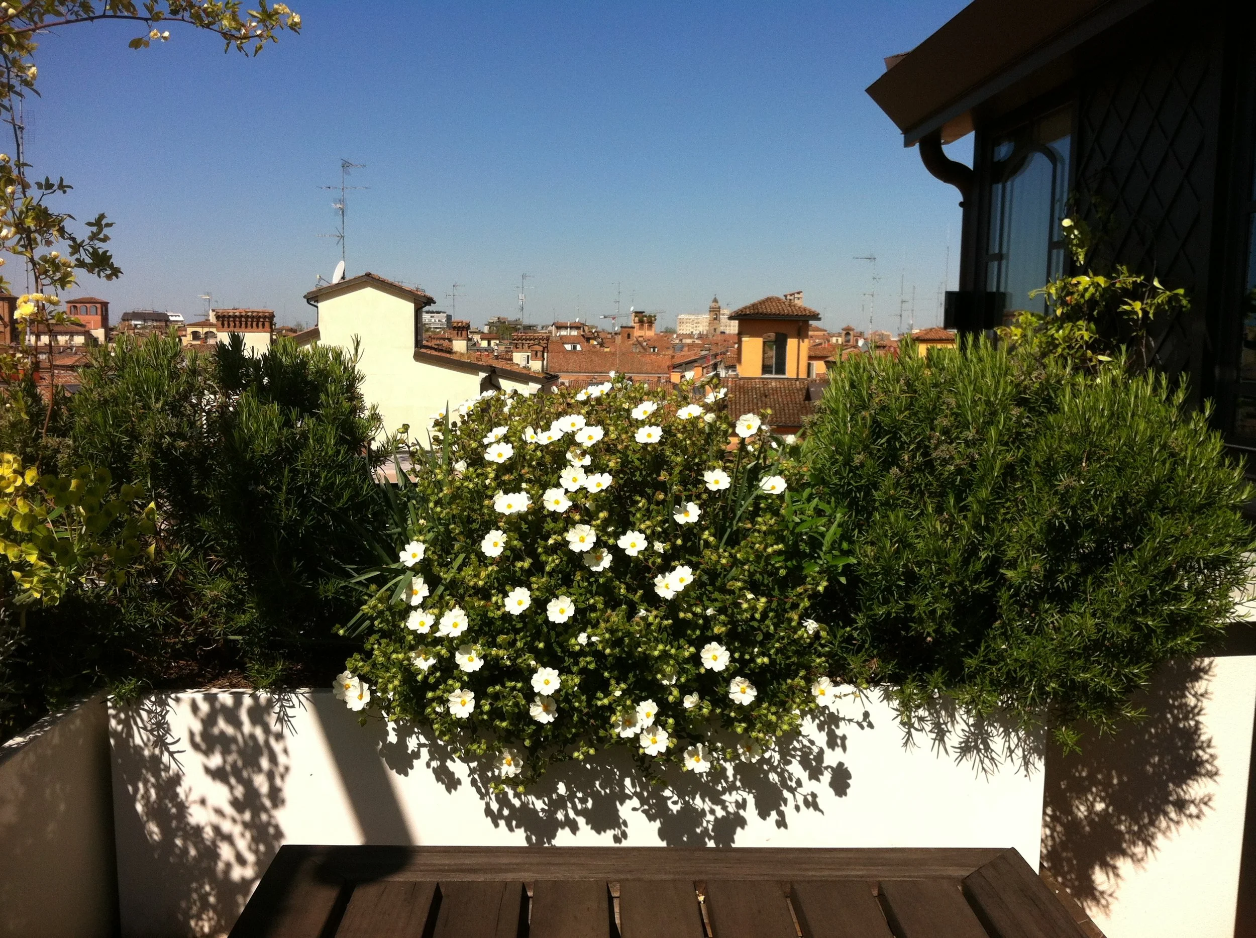 La posizione fortemente assolata e calda di questo terrazzo incastonato fra i tetti del centro storico di Modena, ha fortemente influenzato la scelta dello stile e delle essenze da inserire: corbezzoli, ulivi, mirti e numerose aromatiche creano l’atmosfera di un tipico terrazzo mediterraneo.